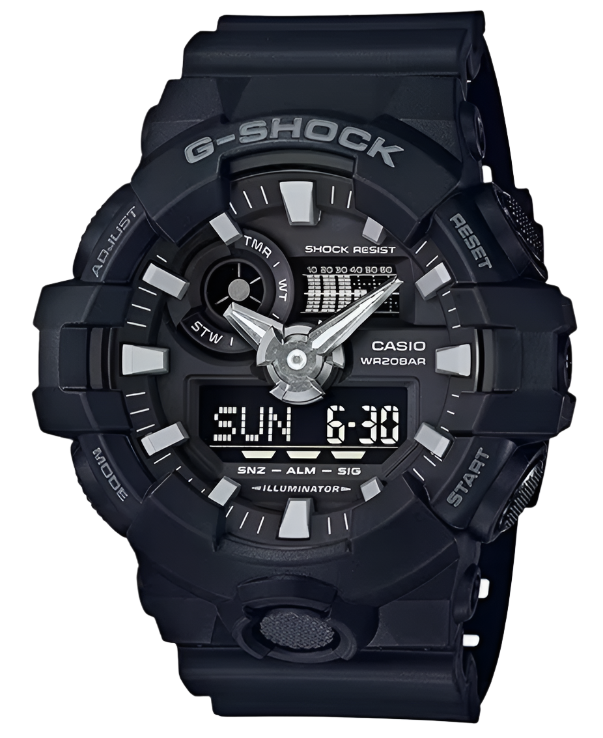 Regular timekeeping: Analog: 2 hands (hour, minute (hand moves every 20 seconds)) Digital: Hour, minute, second, pm, month, date, day