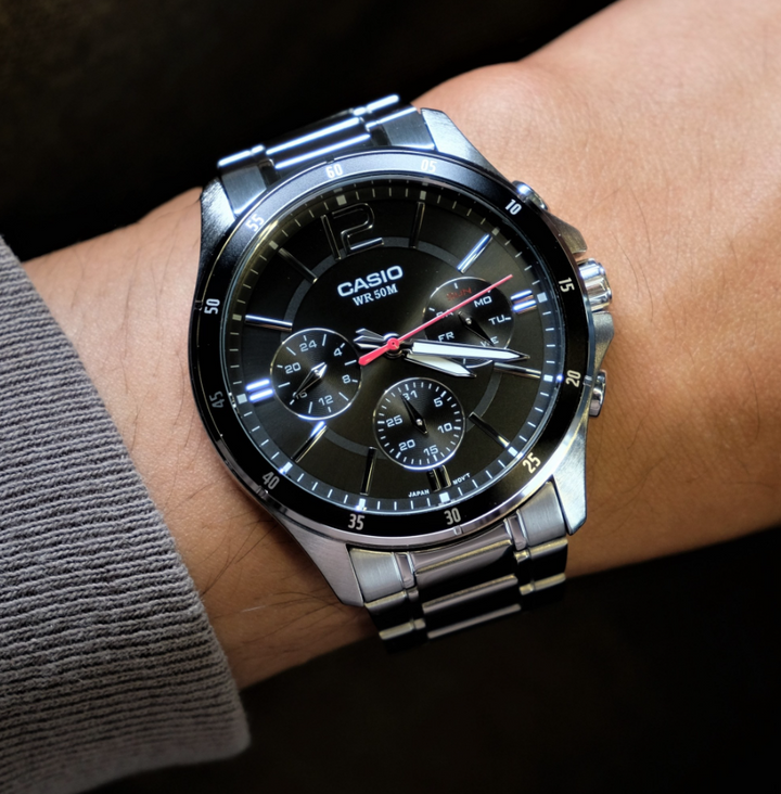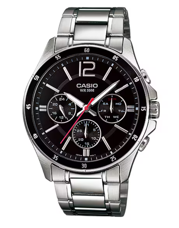 Regular timekeeping: Analog: 3 hands (hour, minute, second), 3 dials (date, day, 24-hour)