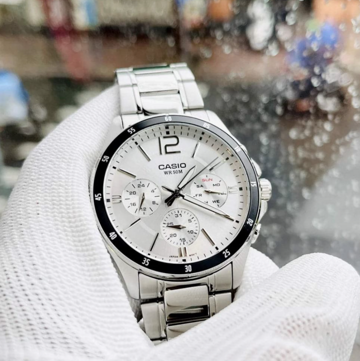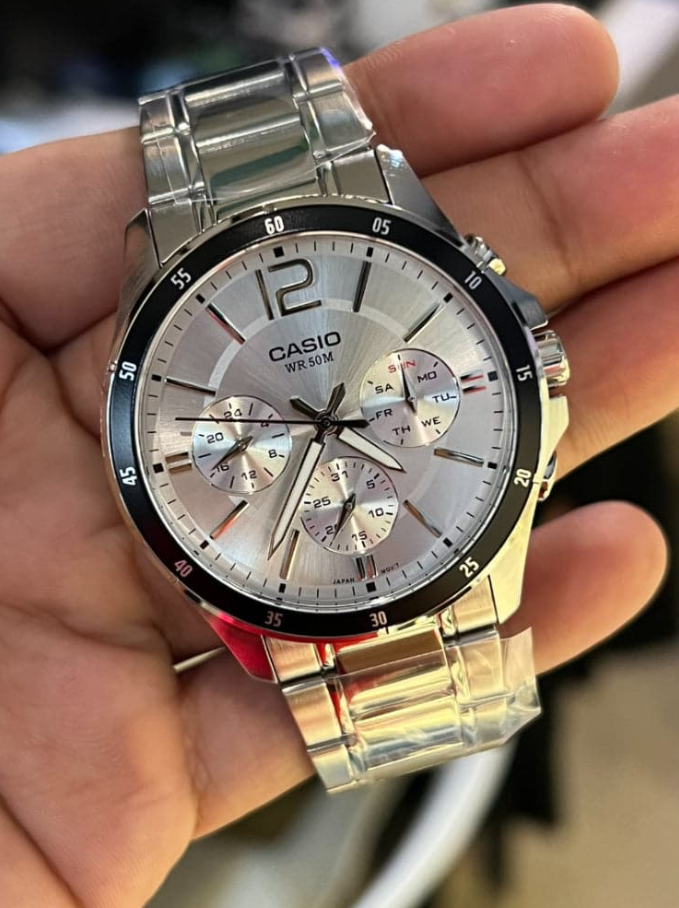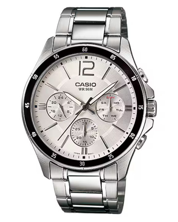 Regular timekeeping: Analog: 3 hands (hour, minute, second), 3 dials (date, day, 24-hour)