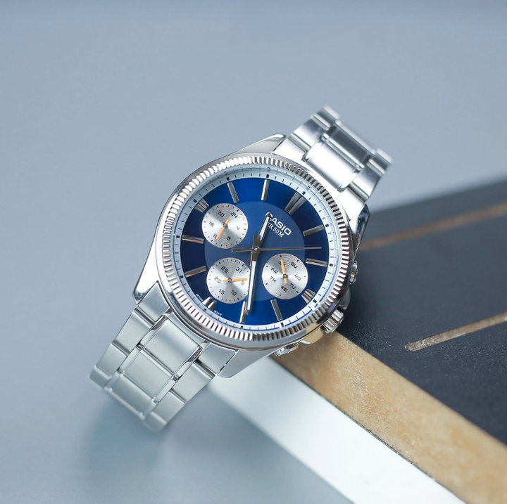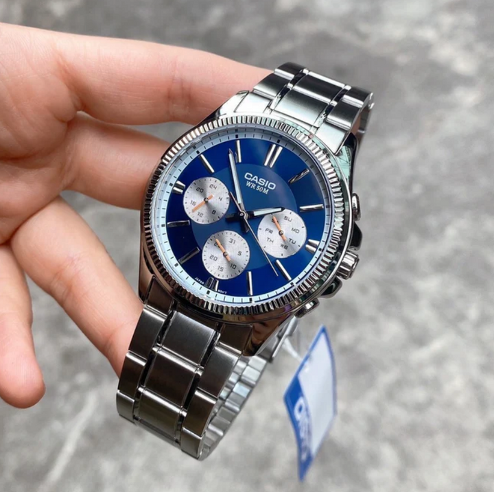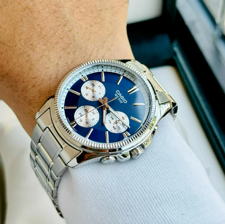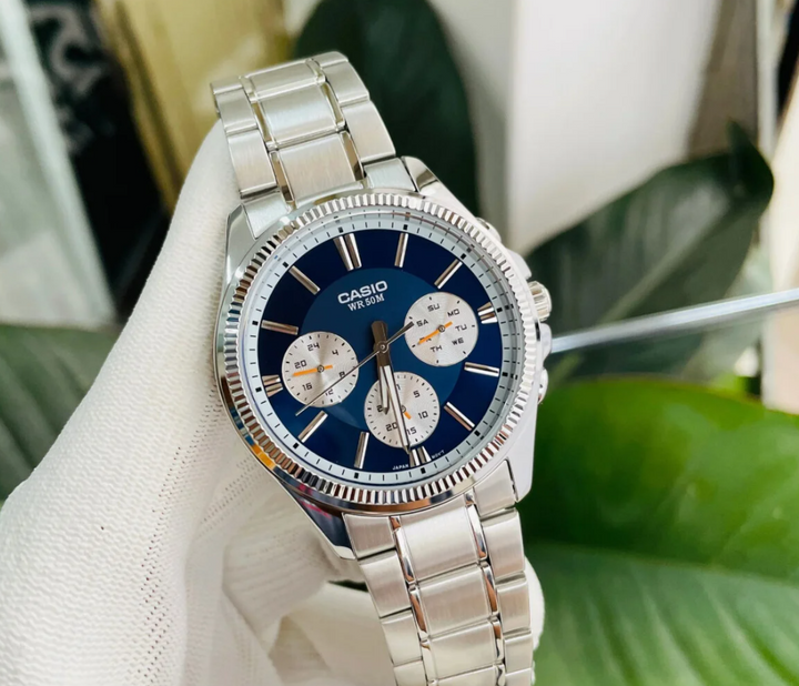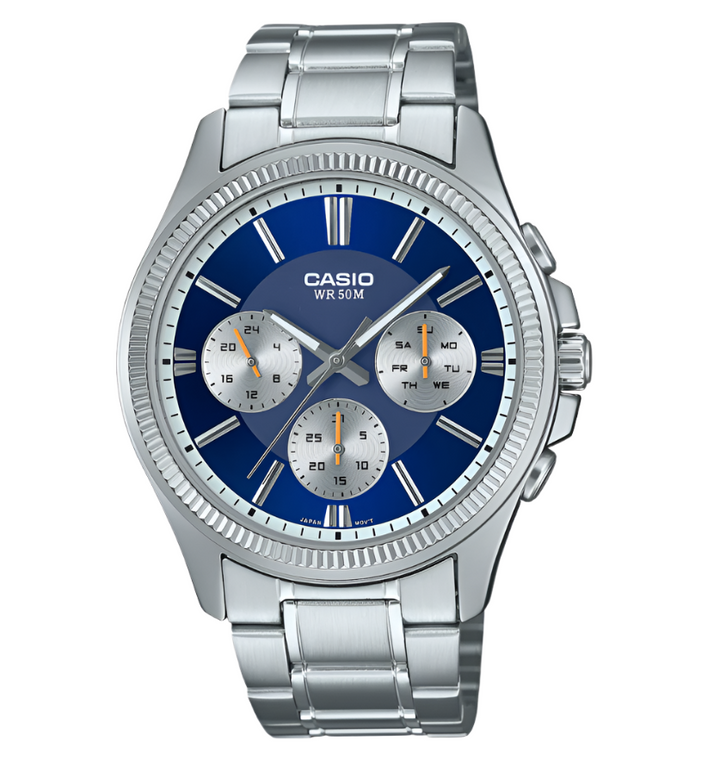 Regular timekeeping: Analog: 3 hands (hour, minute, second), 3 dials (date, day, 24-hour)