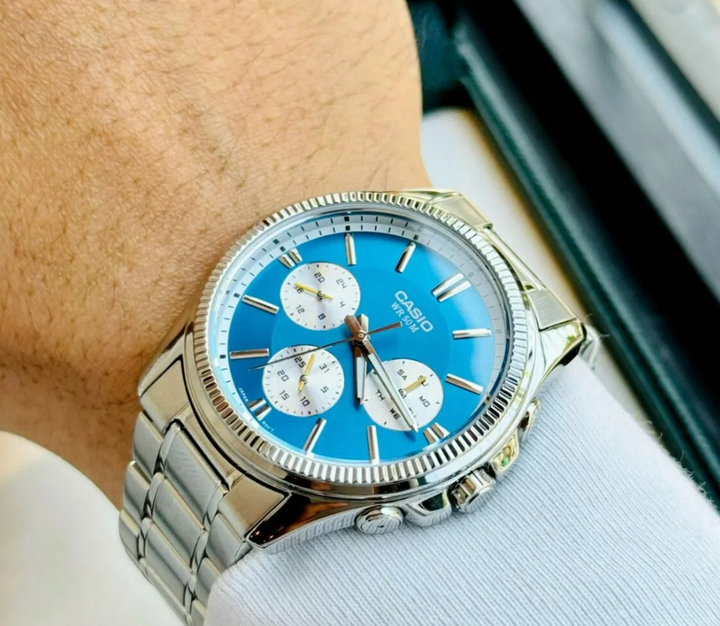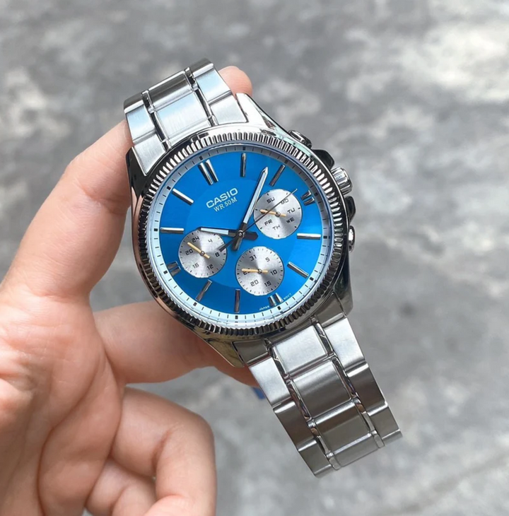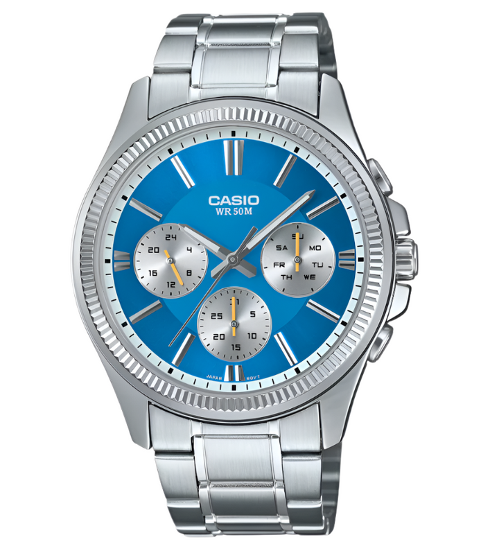 Regular timekeeping: Analog: 3 hands (hour, minute, second), 3 dials (date, day, 24-hour)
