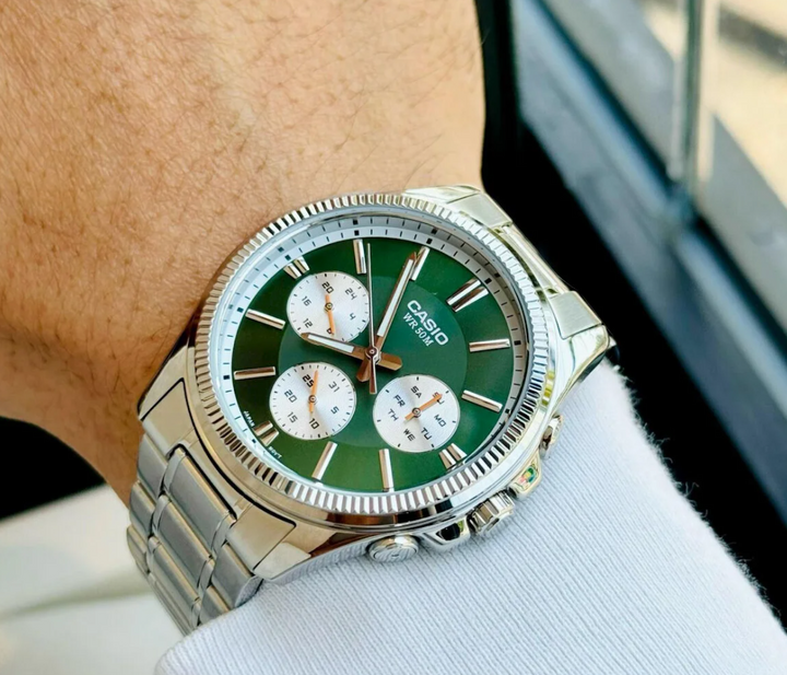 Regular timekeeping: Analog: 3 hands (hour, minute, second), 3 dials (date, day, 24-hour)