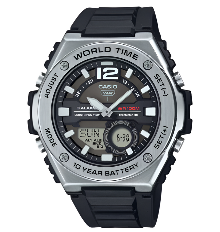 Regular timekeeping: Analog: 2 hands (hour, minute (hands move every 20 seconds)) Digital: Hour, minute, second, am/pm, month, date, day